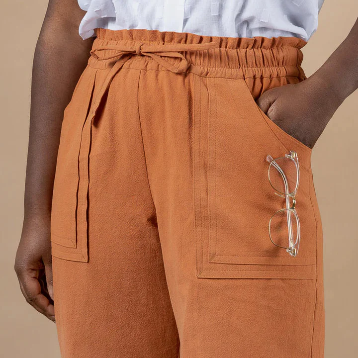 The Sepia Pants + Shorts have a clever design that blends style and comfort. Functional double pockets in the front are sewn to create a floating effect, with additional topstitched pockets in the back. A traditional elastic waistband is elevated with a fluted paperbag edge and optional drawstring.