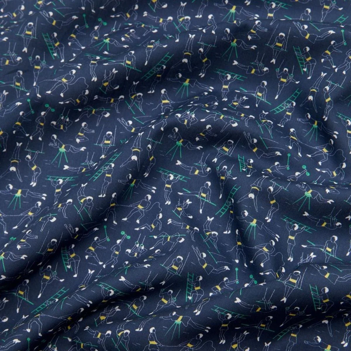 Gymnasium is a quirky conversational design of practicing acrobats and gymnasts, all competing in their various athletic events; parallel bars, still rings, balance beams, vaults and weightlifting. This simple and illustrative line drawn print was recreated from a 1970s Liberty design.